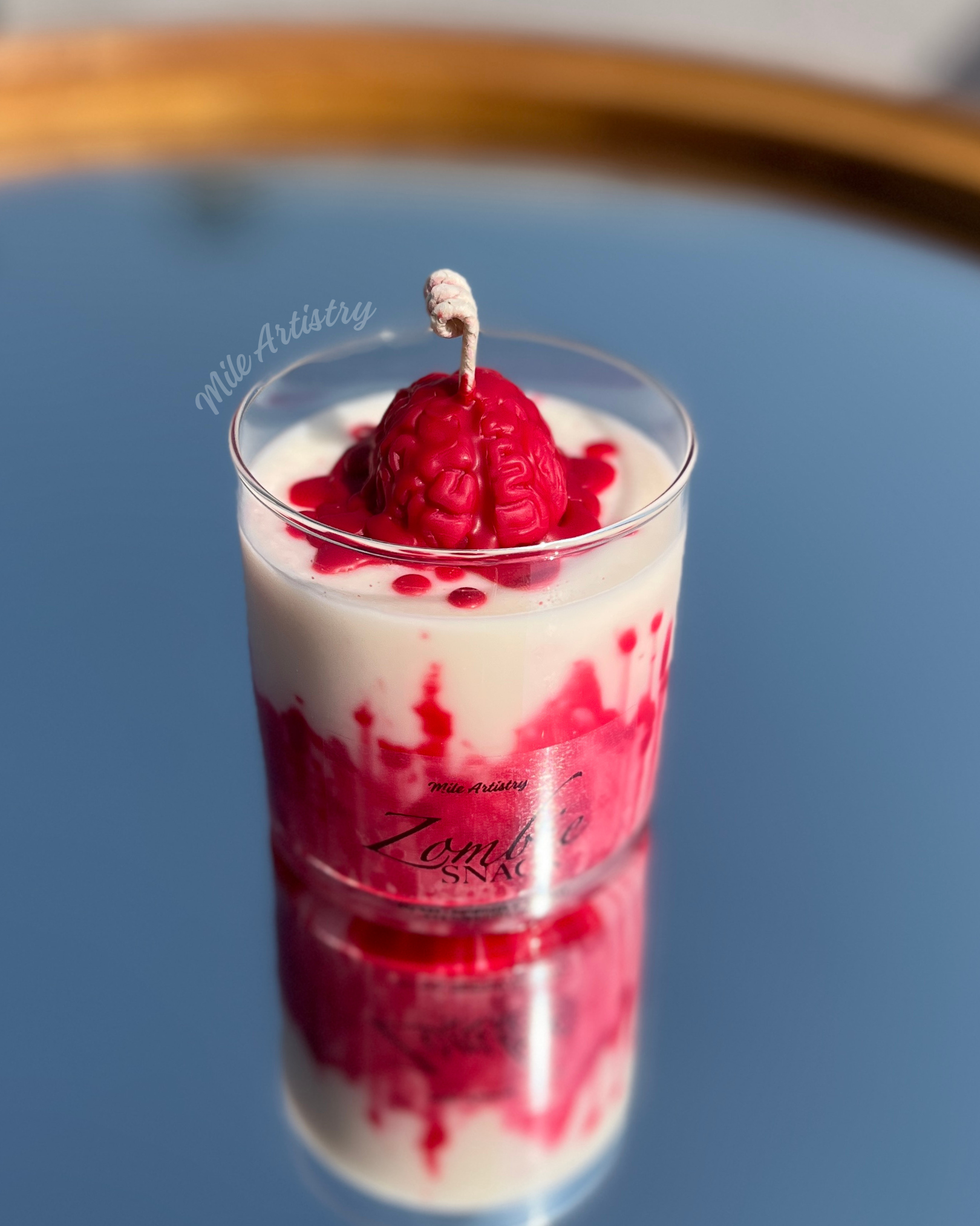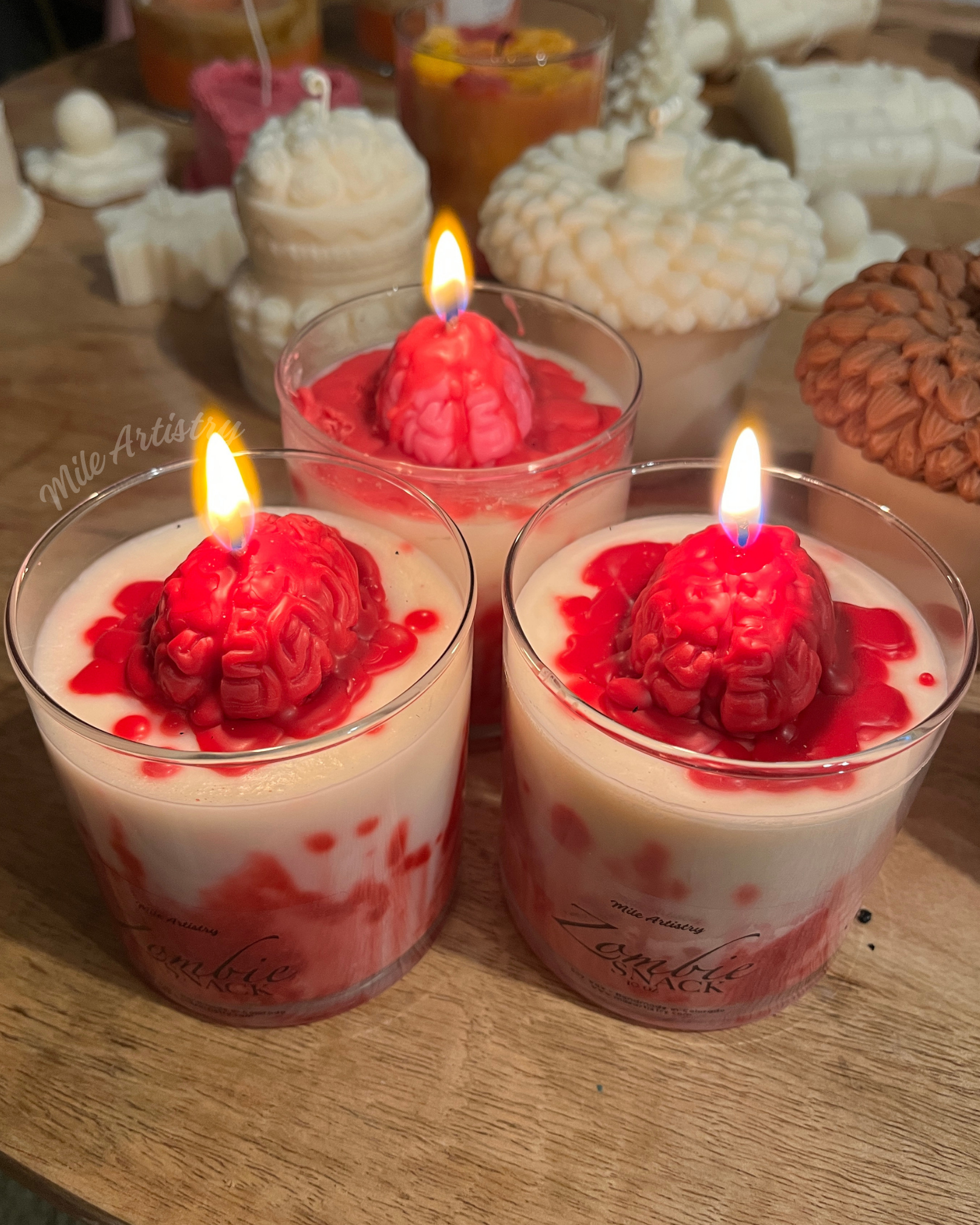 Crowned with a realistic red brain, surrounded by pools of crimson wax that perfectly mimic fresh blood. Each candle is handmade, so every brain and splatter is one-of-a-kind.